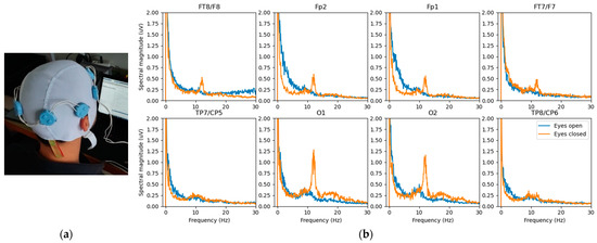 Remotely powered cooperative sensors based on the approach shown in Figure 3: (a) study prototype consisting of 8 EEG sensors; (b) power spectra for each electrode showing the increase in power at certain frequencies resulting from closed eyes (orange) versus open eyes (blue).