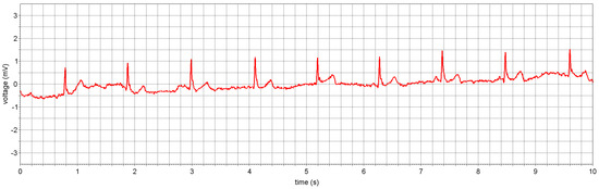 Another important step demonstrating the feasibility of the proposed approach is shown in Figure 14 where two ASICs (see Figure 13a) were applied to stainless-steel dry electrodes on the body, as shown in Figure 14. Despite the use of an optocoupler (DLN-4SE), some 50 Hz problem remained, but at a low enough level to allow acquisition of a clear ECG (see Figure 14). The 50 Hz problem should be fully resolved when the central unit will have been made ‘wearable’ with a floating power supply and when a few other defects discovered during this exploration phase have been corrected.