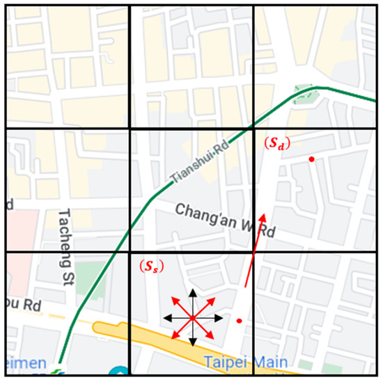 - Grid directionality and source-to-destination directionality for intergrid routing: By analyzing vehicle trajectories in the overall network environment, we define the number of outgoing vehicles from the current grid to the adjacent grid as the grid directionality of this adjacent grid in this paper. We believe that the grid directionality has an important impact on increasing the successful transmission rate and reducing the delay of the packet delivery. If you select a neighbor grid that is more in line with the vehicle’s driving direction, i.e., the grid with higher grid directionality, as the next-hop grid to forward the packet to, the packet has a higher probability of reaching the destination. In addition, the direction from the source node to the destination node, i.e., the source-to-destination directionality in this paper, also guides the best selection of the next-hop neighbor grid. If Q-learning selects a neighbor grid that has the higher grid and the source-to-destination directionalities, this grid will obtain a higher reward and Q-value, which are used as the decision basis of the intergrid routing. As shown in Figure 1, the starting position of the packet is at , and it will be sent to the destination at . Because the Q-value of is the highest one among all neighbor grids of , the intergrid routing for selects as the best next-hop grid. This means that the intergrid routing can use the grid directionality to train the Q-model and select the most plausible neighbor grid to forward the packets to.