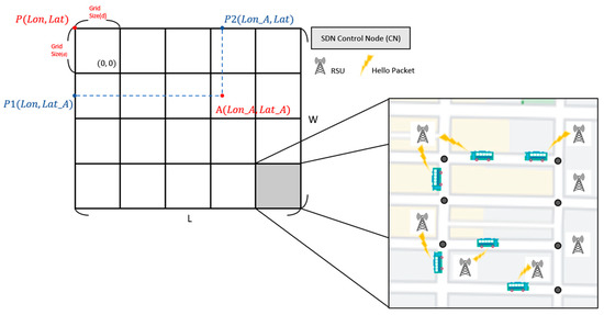 The entire SD-QGrid has an SDN Control Node (CN), which is responsible for initializing the grid structure of the entire map by defining the grid size, cutting the experimental map, and calculating the grid where all vehicle nodes are located. In addition, each grid needs to be equipped with an RSU, which can communicate with the CN through wired lines, at each intersection to collect vehicle trajectory information of all vehicles located at road segments connected to this intersection. Each vehicle on a road segment assumes to own the communication module and the GPS receiver such that it can periodically broadcast its instant information, including the vehicle ID, velocity, GPS position, moving direction, etc., to the first reached RSU through the HELLO messages. In this way, the loss of vehicle information caused by building obstacles in the grid can be reduced [29].