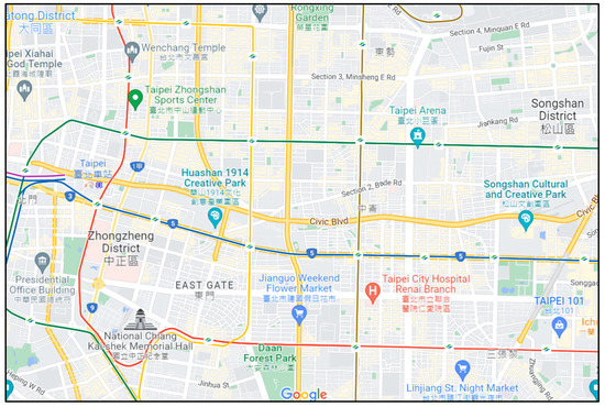 This project uses the data of Taipei City’s bus movement trajectory [30]. First, we planned a latitude and longitude range in Taipei City, and the vehicles appearing in this range were used as research data and recorded in tables. The first table records the name of the route, the license plate number, the direction of departure and return, and the time when it first appeared in the data, which is used to record the departure sequence of the license plate number corresponding to the bus route, and records the return time in the direction to and from this vehicle node. The other table records the longitude and latitude of each vehicle node at each time point, and the coordinates of the grid where the vehicle node is located, which is used to record the actual trajectory of each vehicle. The map of this experiment is shown in Figure 5. The longitude is from 121.5083335 to 121.5677824, and the latitude is from 25.0283751 to 25.0644845. The length of this map is 6000 m, and the width is 4000 m.