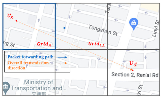- The QGrid [16] divides the entire map environment into equal grids, and uses Q-learning in advance. It uses the number of vehicles in the area as a parameter, and calculates the Q-table in advance to determine the transfer direction between grids, which is a macrotransfer consideration. QGrid_G uses the greedy method of packet transmission, which preferentially selects the neighbor node closest to the destination. QGrid_M uses the two-hop Markov prediction [26,27,28] method to predict the grid that the packet will pass through in the future, and preferentially selects the neighbor node with a higher probability of entering the next-hop grid as the next-hop node. The above two methods are microscopic transfer considerations. The advantage of these is that the transmission of packets is determined by considering the different macro- and microlevel aspects at the same time. Considering the number of vehicle nodes in each grid, the packets are preferentially transmitted to the grid with more vehicle nodes so that the packet loss rate is reduced. The disadvantage is that the vehicle density is only considered, and the influence of the overall movement direction between grids on the overall environment is not considered. The advanced QGrid is a routing protocol improvement made by QGrid, which is for vehicles with relatively regular and fixed trajectories, such as bus nodes, in the network environment. The vehicle node carries the packet to the destination grid and then continues the next-hop packet forwarding. The advantage of this is that it considers the reference vehicle trajectory, as well as the next-hop node selection, based on the trajectory information. The disadvantage is that even if the vehicle node has neighbor nodes, it still needs to continue to carry the packet until it reaches the grid destination where the node is located, resulting in a longer packet transmission delay time.