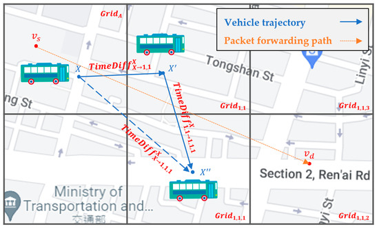 - Two-hop directionality for intragrid routing: By analyzing the historical vehicle trajectories to determine the grid directionality of each grid, we can select the neighbor vehicle whose future driving trajectory goes to the best next-hop grid selected by the intergrid routing. However, there may be more than one possible neighbor vehicle that meets the above conditions; thus, how to make an appropriate choice is the important issue to address. As shown in Figure 2, vehicle node located in has two neighbor nodes, and , located in the best next-hop grid . Which of the two is the best relay node? If a neighbor node whose future driving trajectory moves to the best next-hop grid first, and then, to the best neighbor grid next, which is called the best two-hop next grid in this article, this node will be a better relay node than any node whose trajectory does not follow this two-hop path. This is because this relay node would have a higher probability to meet the destination node than others, even though it does not meet any neighbor node on this two-hop path to forward the packet to, but has to carry the packet by itself to the destination using SCF. Hence, this paper proposes two-hop trajectory-based routing (THTR) as follows. THTR first performs the intergrid routing on the best next-hop grid, i.e., , of to select the next best neighbor grid, i.e., . It then analyzes the historical trajectories of and located in the best next-hop grid, , to find their future positions. If will enter the best two-hop next grid at position , it would be a better strategy for to forward the packet to node instead of , because the future position of , that is, , enters later.
