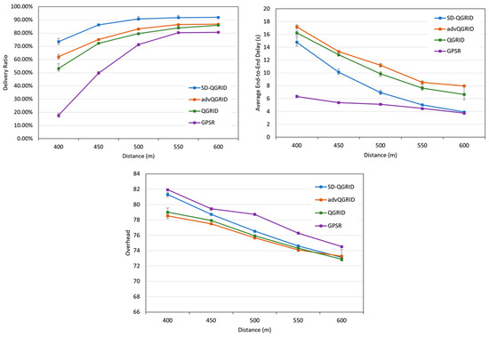 Performance improvement of SD-QGrid compared to routing protocols with distances.