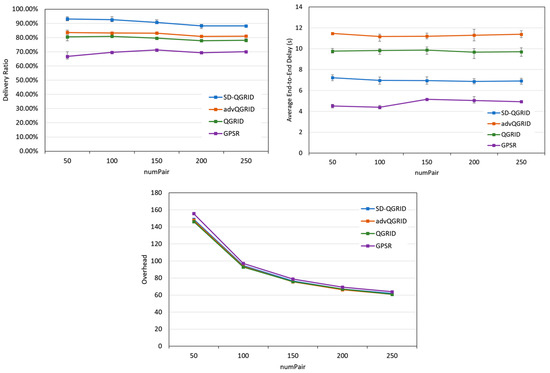 Then, we compare the effect of the fixed number of nodes (numPair) on the performance of the routing algorithm. As shown in Figure 16, as the numPair gradually increases, it means that the total number of packets in the overall network increases, and the transmission success rate and overhead of the four methods decrease accordingly. However, the end-to-end delay is relatively stable. Although our proposed SD-QGrid method pays slightly more overhead than QGrid and its improved advQGrid method, it achieves the highest transmission success rate and the lowest end-to-end delay. In conclusion, compared with QGrid, our method increases the average delivery ratio by 13.66%, reduces the end-to-end delay by 27.67%, and pays a 0.51% overhead, which is shown in Table 11. Compared with advQGrid, the average delivery ratio increases by 9.27%, the end-to-end delay decreases by 35.26%, and the overhead is 1.01%.