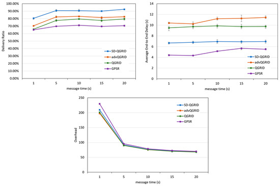 Finally, we compare the effect of the packet generation interval (message time) on the performance of the routing algorithm. As shown in Figure 17, as the message time gradually increases, the number of packets in the overall network decreases, and the transmission success rates of the four methods increase. The overhead decreases, and the end-to-end delay remains relatively stable. As shown in the data graphs of the three horizontal-axis parameters mentioned above, compared with QGrid and its improved advQGrid method, our proposed SD-QGrid method pays some extra overhead, but still achieves the highest transmission success rate, and also has the greatest degree of end-to-end delay reduction. In conclusion, compared with QGrid, our method increases the average delivery ratio by 16.47%, reduces the end-to-end delay by 28.65%, and pays a 1.42% overhead, which is shown in Table 12. Compared with advQGrid, the average delivery ratio increases by 10.77%, the end-to-end delay decreases by 35.08%, and the overhead is 2.31%.