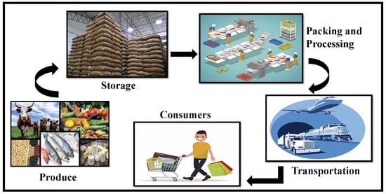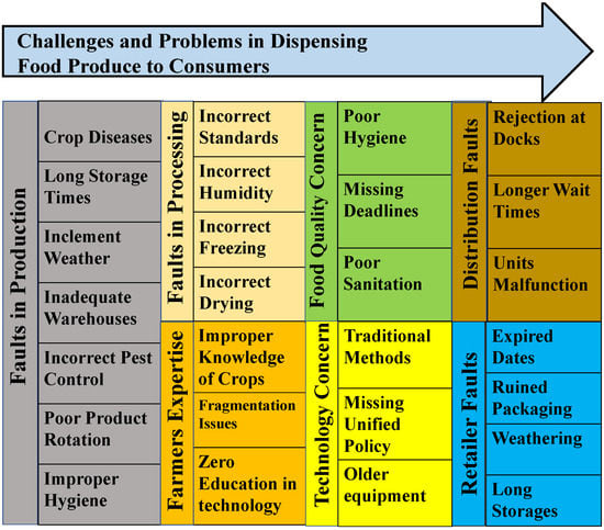 Food quality is an essential concern in a supply chain because it is directly related to the well-being of individuals. The quantity of high-quality agricultural products available to the consumer can be unexpectedly reduced for various reasons at different stages of the supply chain, as shown in Figure 4. Circumstances for food quality degradation can occur due to unhealthy sanitation, unhygienic conditions, and missing deadlines between the supply chain participants. In food production, due to disease and inclement weather conditions, the crops can go unharvested and left in place to waste. Cosmetic imperfections of the produce can occur either during or after the harvest. Inefficient and long storage times after the harvest lead to production cost diminution. Storage issues can cause a lack of proper hygienic places for keeping the product nutritious and safe to consume. Due to inadequate warehousing facilities, wrong temperature, humidity, incorrect pest control procedures, and poor product rotations, the food quality can be degraded, making farmers face difficulties in getting reasonable prices from purchasers []. During the processing of the products, freezing, drying, and slicing are standard measures for making any frozen foods or produce. If the procedure cannot maintain correct temperatures during manufacturing, it can lead to the spoilage of food.