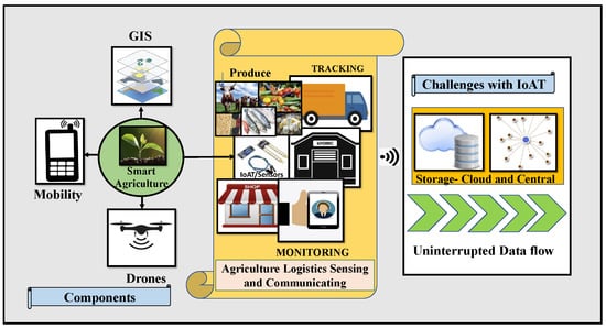 Smart agriculture is one of the application fields of intelligent systems whose goal is to provide solutions for business processes using the IoAT (Internet of Agricultural Things). Advanced industries are using the IoAT and web-based solutions for incorporating modern techniques for data collection and the distribution of agricultural produce, along with implementing automation with security. Still, these approaches have limitations when bringing heterogeneous data into a unified system, raising privacy challenges and futile access control mechanisms []. Smart “things” employing a single point database system to store the statistics are having latency problems and Internet discontinuity issues for data flow and face possible attacks on the useful information []. Figure 2 demonstrates the components utilized in Smart Agriculture and some of the challenges of the IoAT in the agricultural product supply flow [].