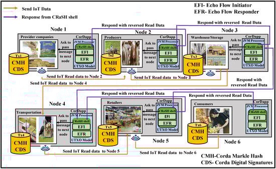 Every node is unique and maintained by different institutes or companies belonging to agricultural stakeholders. In the architectural design presented in Figure 7, each logistic stage represents an independent node managed by their respective data centers connected via the Internet. The IoT devices are connected to each of these agricultural string logistics embedded with the Corda Shell application blockchain. The starting node contains an initiating flow that is given from the command-line CRaSH shell, which is a JVM-based instance. This flow helps start the entire echo process by sending the collected information from the IoAT to the recipient’s node. The second node waits for the incoming data to send an acknowledgment by means of a responder flow. The shell acts as a bridge between the Corda container and its services within the JVM. After initiator and responder flows are written, they are packed, organized, and compiled in respective JAR files. These JAR files can be shared among the nodes that are germane. The communication between each logistic node is a similar process using Corda flows for tracking, saving, and forwarding immutable data towards consumers in the end.