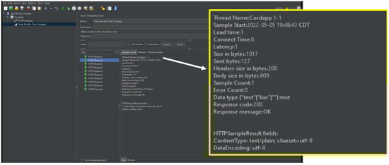 JMeter Corda can be used for testing the performance of the Corda application flows. The Graphical User Interface (GUI) mode of the JMeter can be started as a client and used to create and view the test plans. The test plans can be generated by three components: Thread group, http request, and listener. We have tested agroSring dataset for private blockchain Corda, as shown in Figure 9, using JMeter and public blockchain, as given in Figure 10 through Ropsten Testnet.
