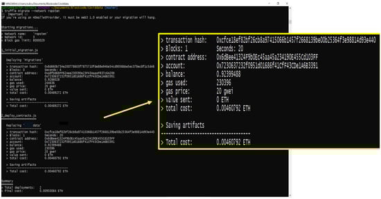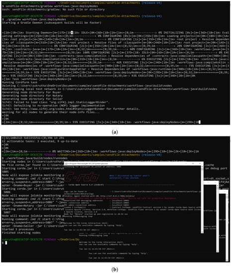 We deployed and ran the nodes as depicted in Figure 13a,b. Once the nodes started to run, the flow was initiated from source Node 1 to Node 2 receiver. The transaction to attach the .zip file was created and processed. Upon completing the process, the notary was used to sign and record the transaction and also obtain the counterparties’ signatures. After collecting all the signatures, they were verified, and the transaction was broadcast to the participant logistic nodes. The flow ended once the total transaction was given an ID. The entire flow is shown in Figure 13c.