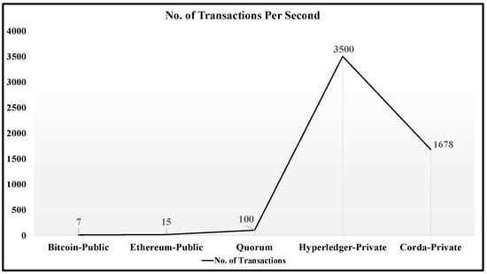 Different blockchain platforms, such as Ethereum, Hyperledger, and Corda are used for developing applications using distributed ledger technologies. Figure 11 shows a graph of transactions per second for each blockchain []. While all these blockchains benefit in terms of data integrity and security, they differ when it comes to vision and the field of application.