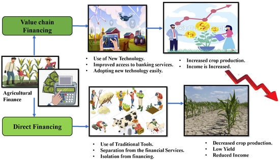 Both Ethereum and Hyperledger are valuable in various specific use cases, whereas Corda is most beneficial in applications related to the financial industry []. Producers make decisions in investment for farming mainly depending on the ease of convenience they get in accessing financial means. When the financial instruments cannot fulfill the farmer’s requirements and provide reduced-risk products, farmers are not interested in using new technologies and updated methods to increase their financial stability [,]. Figure 12 shows how agricultural finance influences yield in the farm sector. There are two types of financing in agriculture: Value chain financing is the number of steps handled by the actors or stakeholders involved in bringing the food produce to the end consumers by adding value at each stage of the product without including banks. In this financing, the actors involved provide loans and add value to the products in each logistic step. With this financing, the farmer is at an advantage in getting new types of equipment and technologies for a good yield, resulting in a reasonable price for the product and increased farmer’s economic status. Direct financing involves banks that give financial loans to the farmers for a certain period of repaying after the harvest.