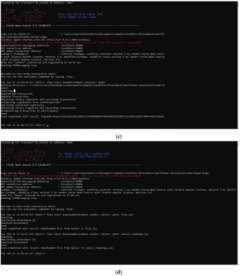 The ID given from the flow start was used to check the file’s authenticity and correct origin. Here, the .zip file was attached to the receiver Node in the flow start. To retrieve the .zip file, node 2 checks for the attachment ID and verifies it to download the zip file, as shown in Figure 13d. Thus, the sensor readings and datasets were successfully transferred between relevant parties while maintaining data integrity and quality with zero transaction fees and validity times in the corDapp environment. The application takes in any file format and up to 10 MB size of the file in the form of a .zip attachment. The entire application phases are shown in Figure 13.