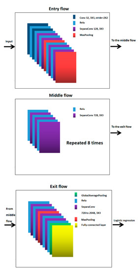 The Xception deep learning network model is divided into three parts: entry flow, middle flow, and exit flow.