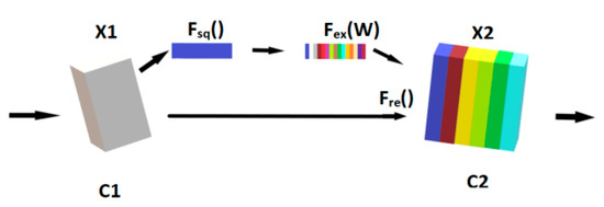 The channel attention operation is performed by squeezing the X1 at Fsq() with the given number of channels as C1. The global information is generated by performing operations on each channel. Next, the channel activation operation is performed at Fex(w), and the weight assignment of each channel is performed by the parameter W. Finally, the weights from the previous step are multiplied by the original feature channels in Fre() to achieve a special focus on important features.