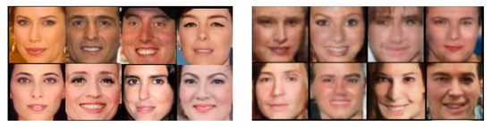 In order to fairly compare the discrimination rates of face images generated by different GAN models, the resolutions of the face images generated by the three GAN models were set to 128 × 128 and 64 × 64 and are noted as GD128 from DCGAN, GS128 from StyleGAN, GP128 from ProGAN, GD64 from DCGAN, GS64 from StyleGAN, and GP64 from ProGAN. A random sample of 1000 images from the generated faces was evaluated using the face quality evaluation network in Tencent Youtu Open Source [23], and the obtained scores were all above 0.9. Generated faces are shown in Figure 4. The left image of Figure 4 contains 128 × 128 resolution face images produced by StyleGAN, and the right image contains 64 × 64 face images generated by ProGAN.