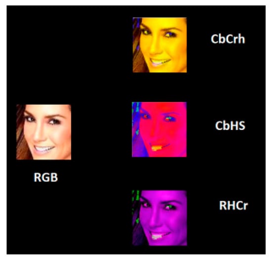 After converting RGB to HSV and YCbCr, the channel combinations were selected by R, G, B, H, S, V, Y, Cb, and Cr. The recombined images of the three channels were input into the Xception model to select the top five accuracy combinations of real faces and deep-network-generated faces. Some samples of the transformations are shown in Figure 7.