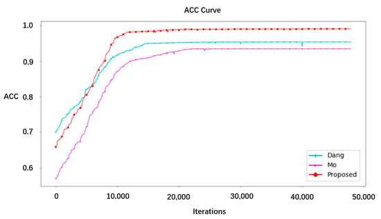 From the figure, it can be seen that the method proposed in this paper was superior to the other two schemes in terms of convergence speed and accuracy, and this network is a lightweight network that is easy to deploy industrially.