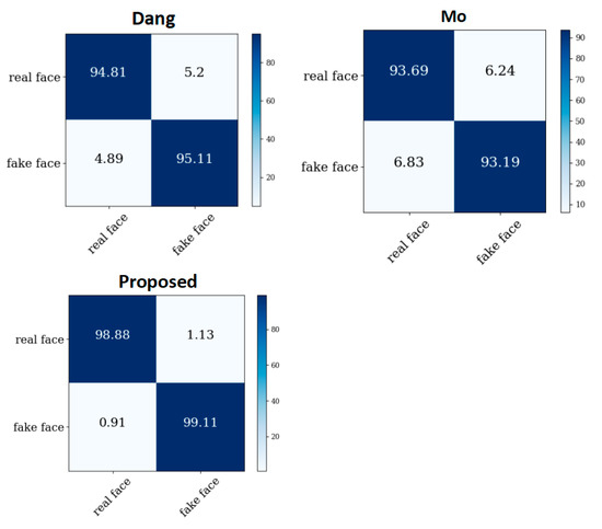 It is true that many technology companies and academics are responding to the “generation” problem by developing “countermeasures” technologies. McCloskey and Albright [7] discriminated generated images based on the presence of underexposure or overexposure in real face images, and an AUC value of 0.92 was obtained in the classification of ProGAN and Celeba. Matren et al. [8] used the visual artifacts that appear in the eyes, teeth, and facial contours of the generated face images for recognition, and AUC values of 0.852 and 0.843 were obtained for the ProGAN, Glow, and Celeba classifications. Zhang et al. [9] theoretically analyzed the existence of the spectral replication of artifacts in the frequency domain and trained a classifier based on spectral rather than pixel inputs to achieve the effective detection of generated artifacts. The corresponding experimental results on CycleGAN obtained an average accuracy of 97.2. Mo et al. [10] used filters with residuals to design deep learning network models to achieve 96.3% detection accuracy in the corresponding dataset. Dang et al. [11] captured the features of the generated face images by setting a specific CGFace layer with an accuracy of 90.1% for the corresponding dataset. In addition to feeding images directly into deep learning models, some work has attempted to improve detection performance by incorporating domain-specific knowledge. Nataraj [12] trained a network to detect generated artifacts by extracting the co-occurrence matrix from the pixel domain images in RGB space, and it obtained an accuracy of 93.78% after the images were detected by JPEG compression. In a Hsu [13] paper, a new two-stream network structure was proposed by using the simplified DenseNet [14] network structure. This network allows for pairwise learning. Specifically, pairwise learning is used to solve the problem that deep learning network models cannot effectively identify deep-network-generated images that are not included in the training process. In addition, different depth features are extracted in the proposed network structure, and the experimental results were obtained on DCGAN and Celeba with a classification accuracy of 97.2% and a recall accuracy of 91.6%. In a study by Zhuang [15], as in [13], to solve the problem that in order to solve the deep learning network the model cannot effectively identify the deep-network-generated images that are not included in the training process, pairwise learning was used, and, based on this, triplet-state loss was used to learn the relationship between the deep-network-generated images and real images. They also proposed a new coupled network to extract features of different depths of the target image, and the experimental results were obtained on DCGAN and Celeba, with a classification accuracy of 98.6% and a recall accuracy of 98.6%. In a study by Carvalho [16], deep-network-generated faces were detected by finding the differences between real and deep-network-generated faces in the eyes. Specifically, when the eyes’ specular highlights were removed from both real and deep-network-generated faces, the deep-network-generated face presented more artifacts. The bottleneck features obtained using the processed human eyes were extracted using VGG19 [17] for feature extraction. Finally, the eyes were fed into the SVM classifier to classify the deep-network-generated and real faces, and the experimental results obtained an AUC value of 0.88 on the corresponding HD face data.
