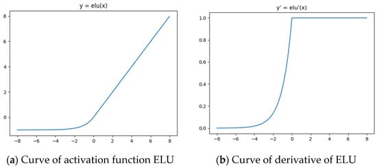 where parameter is set to 1. The curves of ELU activation function and its derivative are shown in Figure 2a,b, respectively. For common activation functions, such as ReLU, the value corresponding to the negative axis is 0. However, the normalized point cloud coordinate interval is [−1, 1], which indicates that the point cloud coordinates will have negative values. As shown in Figure 2a, the value corresponding to the negative axis of the ELU activation function is non-zero. Therefore, using ELU as the activation function, the negative value information in the reconstructed network will not be lost in the forward propagation process. As shown in Figure 3b, the derivative of ELU is also non-zero on the negative axis. In the backpropagation process of the network, the negative gradient will not be lost, and it can help update the network weight.