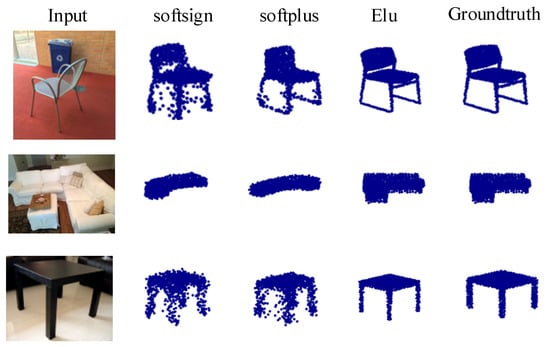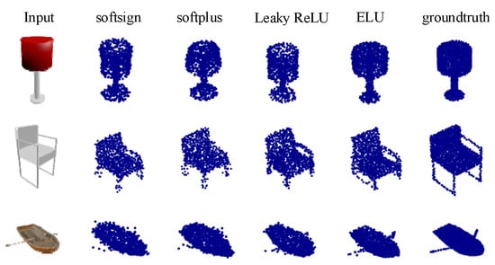 Figure 4 shows the point cloud reconstruction results obtained using different activation functions on the ShapeNet dataset. We can see that the network trained by ELU considers details better and preserves finer geometric information.