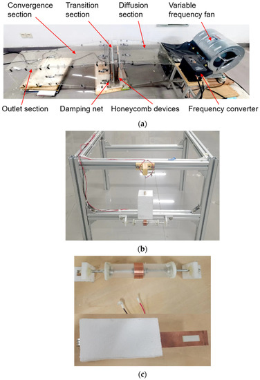 Figure 2a shows the simple wind tunnel used in the experiment. Its sectional dimension is 300 mm × 300 mm and is mainly composed of a diffusion section, transition section, contraction section, and outlet section. Additionally, a damping net and two honeycomb devices installed in the transition section ensure uniform and stable air flow in the outlet section. During the experiment, the variable frequency fan (DWF 3.15L, Shandong kepuda fan Co., Ltd., Dezhou, China) was adjusted by the frequency converter (V8 4T 4R0GB, Shenzhen Weike Technology Electronics Co., Ltd., Shenzhen, China) to control the wind speed in the wind tunnel.