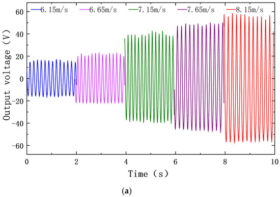 Figure 9a,b show time-domain curves of output voltage and current of the PEH and the EEH under the above five wind speeds, respectively. It can be seen from Figure 9a that the output voltage of the PEH is relatively stable before and after the jump, which is similar to the sine function graph. Figure 9b shows that the output current of the EEH is chaotic before the jump, and the waveform tends to the sinusoidal function graph after the current jump. This shows that the vibration form of the EEH changes obviously before and after the jump.