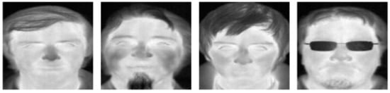 Face recognition is one of the biometric qualities for security that has been most frequently used successfully in recent times. The study of biometrics and computer vision face recognition has proven to be one of the most difficult of topics. To solve the pose and illumination issues for visible face photos, many face recognition algorithms have been developed [1]. However, such a system’s thermal face images are susceptible to fluctuations in the surrounding temperature, which can result in identification errors. Infrared images work well in all weather and day/night situations to locate people from their surroundings depending on the radiation differential [2,3,4,5]. The primary concept behind thermal imaging is that each object produces infrared energy uniquely based on its properties and temperature. As a result, every object has a unique thermal signature. The pattern of the superficial blood vessels that are present beneath the skin of the face is the main source of this signature. Each person’s thermal image is distinct, since each face has a different vascular and tissue structure. There are many ways to find faces, from using image features to deep learning techniques. Facial recognition technology does not function properly without a reliable facial detection algorithm that is effective under different circumstances [6,7]. When face images are taken in a controlled setting, face identification based on the visible light spectrum has demonstrated good performance. However, under uncontrolled lighting circumstances, the effectiveness of such facial recognition systems is dramatically reduced. When the illumination is poor or the face is not evenly clear, the accuracy of face recognition rapidly decreases. Face identification is a difficult task in working with uncontrolled illumination when there are visible representations of the face [8,9,10,11]. In recent times, face recognition has utilized thermal images of the face. Figure 1 shows an example of face recognition thermal images.