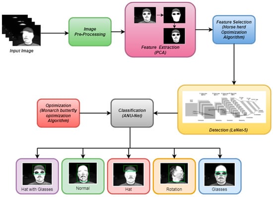 Sometimes, face recognition in thermal images is a difficult process under various stances and lighting effects [12]. There are many methods to identify faces and classify them based on their expressions. However, these methods also have some difficulties in detecting faces. Detecting a face from thermal images has some issues and challenges. Higher dimensional datasets are required, to speed up the computation, and parallel algorithms can be employed. Illumination changes have little effect on face identification in thermal images. Moreover, when spectacles are visible in facial images, thermal imaging has very little success [13,14]. So, this paper classified the objects and actions in the face after detecting the face in thermal images. This is because detection of the face takes priority over finding the objects and actions on faces. This work proposed thermal images to enhance the performance of deep learning-based facial recognition systems. The goal of this work is to enable face recognition and classification to provide better outcomes. We proposed a method for detecting and classifying objects and actions, such as hats, glasses, normal, rotation, and hat with glasses, from human thermal face images based on a deep learning model in this work. This model has five steps; initially, images are resized, and the input thermal image is converted to grayscale image using the median filter in pre-processing. In addition, principle component analysis (PCA) is used to extract the features from pre-processed images. Furthermore, for feature selection, the horse herd optimization algorithm (HOA) is used. Then, the LeNet-5 technique is utilized to identify the human faces in thermal images for good classification results. Finally, we classify the objects and actions in face images, using the ANU-Net method combined with the Monarch butterfly optimization (MBO) algorithm to achieve a higher classification accuracy. The paper’s key contributions include: