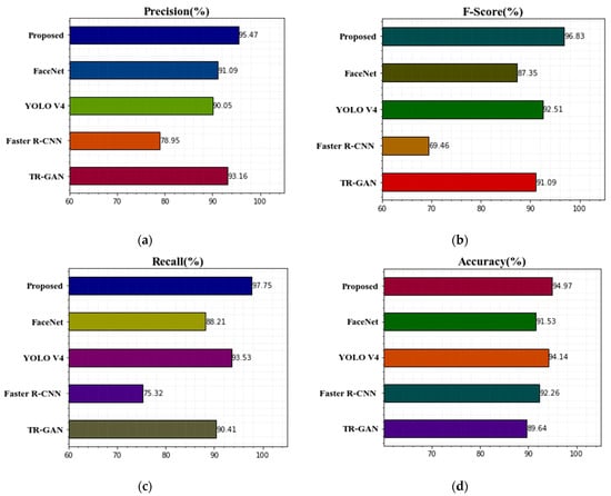 Table 4 shows our findings based on accuracy, precision, recall, and F-score without an optimization algorithm. Figure 6 shows the comparison of the proposed technique’s classification results with other existing techniques with optimization algorithm graphs for precision, F-score, recall, and accuracy. Table 4 shows the results for TR-GAN [19], Faster R-CNN [17], YOLO V4 [26], FaceNet [27], and the proposed ANU-Net with MBO technique on the Terravic Facial IR Database in terms of recall, precision, F-score, and precision. Based on the results, we can see that the proposed methodology has higher classification accuracy values than other existing deep learning approaches in terms of recognition rate accuracy, recall, precision, and F-score. The achieved higher F-score for the proposed technique is 97.15%, compared to 91.09% for TR-GAN [19], 69.46% for Faster R-CNN [17], 92.51% for YOLO V4 [26], and 87.35% for FaceNet [27]. The proposed method’s acquired precision is quite similar to SSD’s precision. Additionally, when compared to other existing methodologies, the proposed approach’s recall is superior. TR-GAN [19] has the lowest accuracy rate, at 89.64 percent. The comparison of the proposed method classification results with other methods with optimization algorithm graphs for precision, F-score, recall, and accuracy is displayed in Figure 6. Compared with other existing methods, the proposed ANU-Net technique achieves higher accuracy with the optimization algorithm. From the experiment analysis, the performance of the classification improved by using the proposed model, and computation time is reduced for training the images.