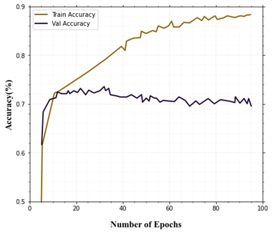 Training accuracy and validation accuracy curves converge in the end, and after 100 epochs achieved an accuracy of 97.54%, which is quite good. Figure 7 shows the training and validation accuracy.