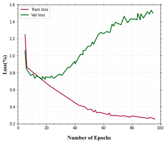 The validation loss curve jumps up and down a bit. However, because the curve does not rise over epochs and the variance between testing and training loss is small, this could be acceptable. Figure 8 shows the training and validation loss.