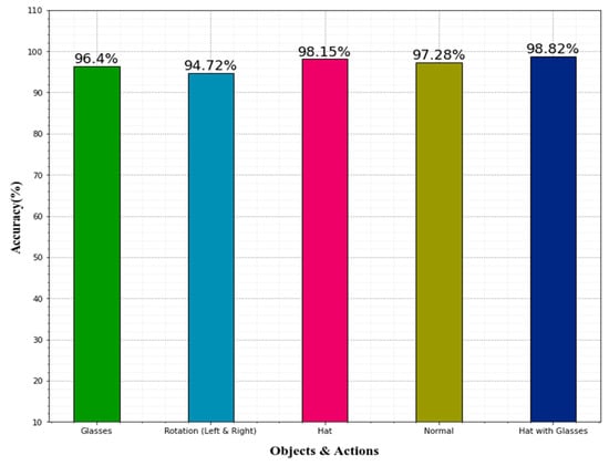 A comparison of accuracy in detecting various human facial emotions is depicted in Table 6. The various face objects and actions include glasses, rotation (left and right), hat, normal, and hat with glasses. The glasses yielded 96.4% accuracy, rotation (left and right) obtained 94.72% accuracy, the hat obtained 98.15% accuracy, normal yield 97.28% accuracy, and the hat with glasses achieved 98.82% accuracy. When observing accuracy among the five objects on the human face, the hat with glasses achieved highest accuracy. Figure 10 shows the graphical representation of the objects and actions on the human face classifications.