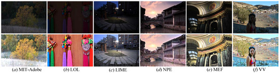Public benchmarks: We performed verification experiments on two paired datasets (LOL and MIT-Adobe FiveK) and four unpaired datasets (LIME, MEF, NPE, and VV) to test their performance in light enhancement. The LOL dataset was captured by changing the exposure time and ISO of a camera and contains 500 pairs of abnormal/normal light RGB-images with a size of 400 × 600. The MIT-Adobe FiveK benchmark contains 5000 RAW-images processed by five professional photographers. Adobe Lightroom was used to transform these images from the RAW to the RGB format to train the LLIE models. The LIME, MEF, NPE, and VV benchmarks contain 10, 17, 84, and 24 images, respectively.