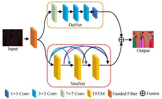 To tackle unsatisfactory contrast and brightness, blurry details, as well as the color deviation of low-light images, we present a new LLIE approach based on the theory that different information in an image is displayed at different frequencies. The overall framework of our FDMLNet, including its three main parts, i.e., frequency division (FD), DetNet, and StruNet, is illustrated in Figure 2. Among these components, FD is employed to separate the high and low frequencies of the input images; DetNet, made up of a Conv, a Conv, and a Conv processes the high frequencies of the input images to preserve inherent detail and condense the noise; the low frequencies of the input images are processed by StruNet, which consists of three feasible feature extraction modules (FFEMs) to promote its brightness and contrast and remove the color deviation.