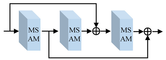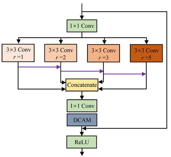 The image dimensionality is reduced by the convolution operation to alleviate the computational load. Then, we extract multiscale information through four parallel branches, which are made up of convolutions with dilation rates , and 5, respectively. Notably, the features extracted by the previous branch are injected into the next branch to adequately utilize the image’s potentially multiscale information. The extraction procedure of the multiscale feature can be described as
