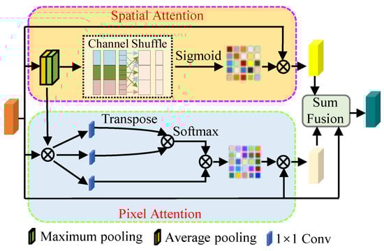In the pixel attention branch, the feature map that fuses features generated by the average pooling and max pooling operations is added into the input data to avoid the influence of the spatial relationship and is recorded as . Then, three Conv operations are applied to and the result of the top branch is processed by a transpose operation. In order to solve the weighted matrices , the transposed result was multiplied by the result of the second branch and then processed by a softmax function. The above procedure can be described as,