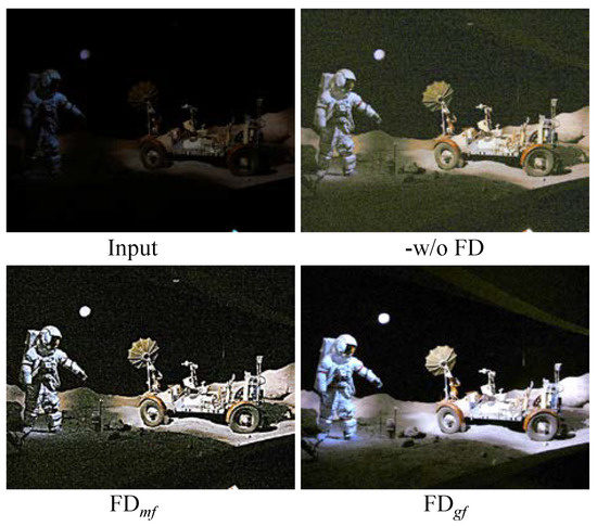 Study of the frequency division: Figure 6 describes the visual enhancement results to verify the effectiveness of the frequency division (FD) operation in our presented FDMLNet model. Among them, -w/o FD represents our designed model without FD operation, FD and FD stand for our developed model employing a mean filter (mf) and a guided filter (gf) to separate the image high and low frequencies, respectively. From the results, we discover that FD could avoid color casts and FD inevitably introduced observable noise. However, FD coinstantaneously compressed the inherent noise and lights up the image.