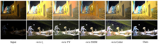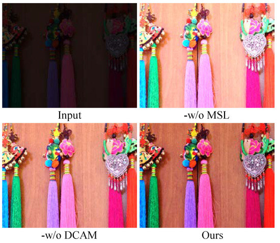 Study of the dual-branch channel attention mechanism: -w/o DCAM indicates that the attention mechanism was not taken into account in our model. As depicted in Figure 7, -w/o DCAM failed to enhance local details and remove the color deviation as well as hand-crafted halos. However, the output image generated by our method showed a high brightness, vivid colors, and clearer details. The PSNR and SSIM [66] of the different operations on the LOL and MIT-Adobe datasets are shown in Table 1; it can be seen that our method generated the highest scores of two elevation criteria on the selected public datasets.