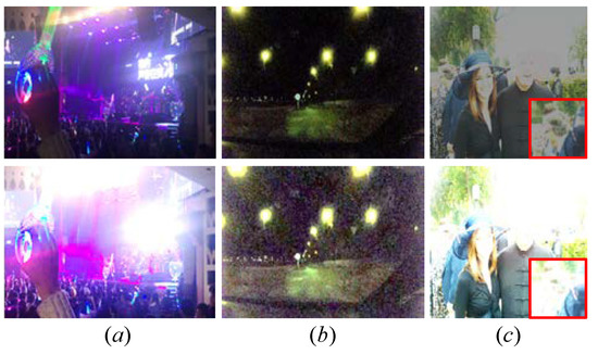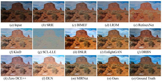 In recent years, learning-based methods containing supervised and unsupervised learning strategies have outperformed traditional approaches in feature representation and extraction and have been applied in object detection, image processing, and other computer vision assignments [42,43,44,45]. LLNet [27], a groundbreaking work for LLIE, stacked sparse denoising autoencoders for light improvement and denoising at once. Lv et al. [46] designed MBLLEN, consisting of a feature extraction, enhancement, and fusion module for facilitating the performance of LLNet. EEMEFN [47] and TBEFN [48] generated normal light pictures by fusing multiexposure images. Subsequently, the pyramid network [49,50], residual network [51], image semantic network [52], semantically contrastive learning [52], and recursive learning network [53] were introduced to enhance the feature representation and extraction of the previously reported model. Moreover, the Retinex theory and learning-based model were combined to make the proposed methods enjoy an appealing performance. For example, Retinex-Net [54] applied Enhance-Net to adjust the light of illumination maps generated by Decom-Net. A regularized sparse gradient was introduced into Retinex-Net to build a more robust LLIE approach. Wang et al. [55] applied local and global features extracted by DeepUPE to learn the mapping relationship from the original image to the illumination image. Zhang et al. [28] designed an enhancement framework (named KinD) that included three stages: a layer decomposition, reflectance recovery, and illumination light adjustment. They [56] then injected a multiscale illumination attention module into the early proposed KinD model to further promote its capacity. However, these Retinex-inspired learning methods also inevitably introduce a color deviation or hand-crafted holes due to an inaccurately estimated illumination. Additionally, the frequency-based decomposition-and-enhancement model [21] was reported to rely on the assumption that the noise exhibits different contrast at different frequency layers. Understandably, supervised methods heavily need extra computing resources to process paired (normal/abnormal) datasets for training. However, these paired images cannot be easily gathered in the real world, and we carefully capture them by artifact synthesizing or altering the exposure time and ISO rating of cameras.