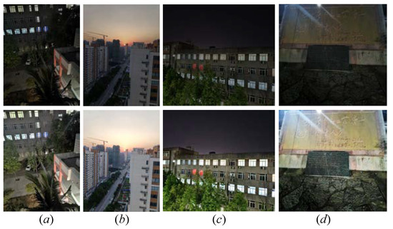 Visual comparisons of the FDMLNet tested on real low-light images. (a,b) captured by Mate 20 Pro, (c,d) captured by Vivo X60. From top to bottom, the first row is the original image, and the second row is the result generated by our method.