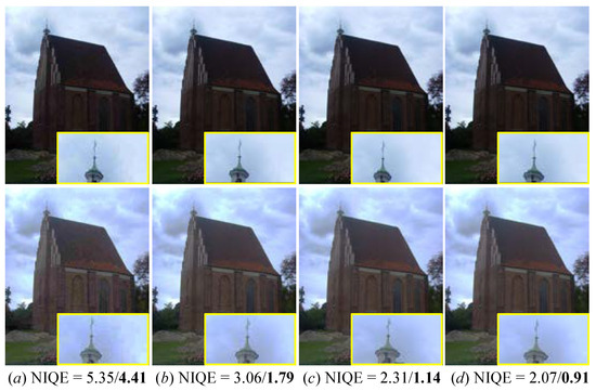 To prove the application of our method in real-world images, we applied our FDMLNet on real low-light images captured by Mate 20 Pro and Vivo X60 phones. The results yielded by our the FDMLNet are depicted in Figure 16. The following observation can be obtained: the enhanced images consistently exhibited a visually pleasing appearance, vivid colors, and more apparent details with the help of our designed learning-based method. Therefore, our proposed FDMLNet model could be applied to promote the quality of images received from a common phone camera, such as a Mate 20 Pro, Vivo X60, and so on. Additionally, we processed the compressed low-light images, which were created by setting the compression ratios to 0.2, 0.5, 0.8, and 1 in order to test our method. The enhanced images and the NIQE (original/enhanced images) are shown in Figure 17. We can easily find that the proposed FDMLNet generated more satisfactory images and had lower NIQE scores under a variety of compression ratios. Unfortunately, our proposed method failed to remove the hand-crafted halos, especially with a compression ratio of 0.2 (observed in picture a in Figure 17).