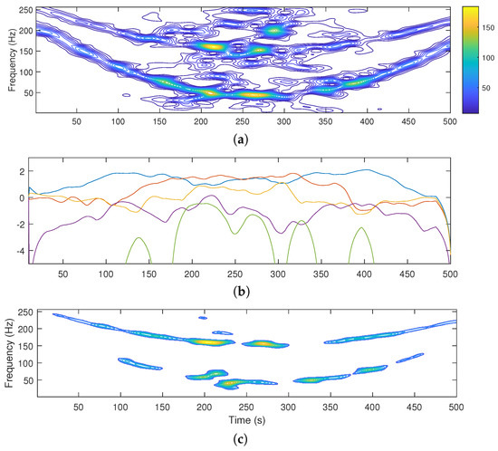 TFD of a noisy signal (a), LRE estimates for classes (1. class blue, 2. class red, 3. class orange, 4. class purple, and 5. class green) (b), and useful information extracted by the LRE criterion (c).