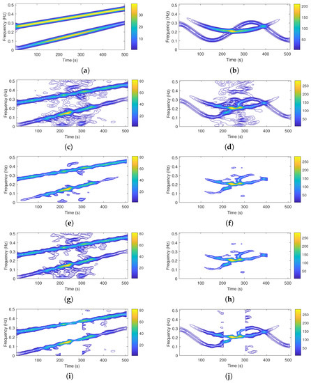 The noisy TFD, together with results produced by the non-adaptive LRE-based algorithm [20] and the proposed block-adaptive LRE algorithm is reported in Figure 3a,c,e.