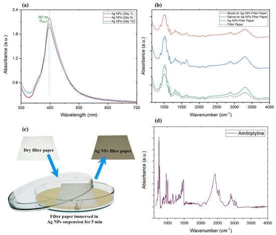 (a) UV/Vis spectra of fresh and aged silver nanoparticle suspension (λmax = 397 nm). (b) Comparison of the FTIR results of filter paper with and without AgNPs, as well as dried blood and dried saliva on AgNP-decorated filter paper. (c) The decorating process of silver nanoparticles onto the filter paper sample. (d) FTIR spectrum of AMT and AgNPs in the suspension.