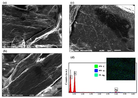 SEM images were used compare the surface of the fabricated SERS substrate with clustered silver nanoparticles in the paper fiber pores (Figure 2a,c) with the surface of the substrate before the modification (Figure 2b). Figure 2c shows how silver decorated the fibers in the filter paper and how the dipping technique achieved a uniform surface coverage of nanoparticles. This silver nanoparticle clustering is responsible for the high SERS activity of the substrate [76]. The stable and homogenous adsorption of AgNPs on the fibers seen in the SEM results is a result of simple van der Waals interactions without the need for any specific chemical crosslinking procedures [53]. EDAX analysis (Figure 2d) of decorated filter paper also confirmed the presence of trace amounts of AgNPs all over the surface. From the elemental analysis graph and the element distribution pattern, it can be seen that the sample had approximately 47% mass of C, 47% mass of O, and 5% mass of Ag.