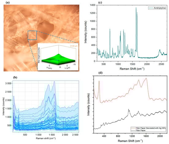 The detection of trace analytes requires suitable sensitivity and quantitative capability of the developed system, while another critical factor is the reproducibility of the signal in the presence of molecules of interest. In the case of SERS, to confirm the application of the substrate and prove the reproducibility of the signals, developing a uniform surface is key [82]. To evaluate these factors, Raman mapping of AgNP-decorated filter paper was obtained and analyzed (Figure 3a,b). A total of 125 points were analyzed in a well-focused section (50× objective; Figure 3a) in three dimensions (20 μm × 20 μm × 10 μm), which resulted in a 3D map that suggested a homogenous surface. Furthermore, calculating the relative standard deviation (RSD) of 40 scans of predominant peaks at 1604.04 cm−1, 1383.97 cm−1, and 254.37 cm−1 at different spots on the surface (fixed Z-axis) gave values of 10.10%, 8.34%, and 7.19%, respectively, revealing that the surface was homogenous and results were reproducible.