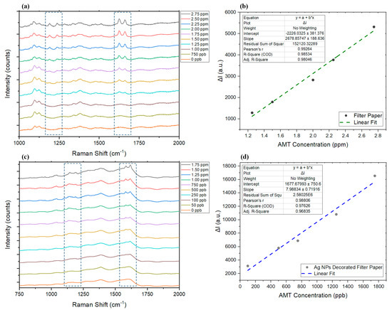 (a) Changes in the Raman spectra in the presence of different concentrations of AMT on the normal paper. (b) The linear range for each tested substrate. (c) The response of the AgNP-modified filter paper to changes in the concentration of AMT and (d) its linear range. ΔI represents the changes in intensity in the presence of AMT compared to the Raman intensity at the peak wavelength of blank sample.