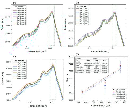 The Raman spectra of the of three tested standard samples of 350 ppb (a), 650 ppb (b), and 850 ppb (c). (d) Linear graph for the mean data collected on each day, along with error bars for each day.